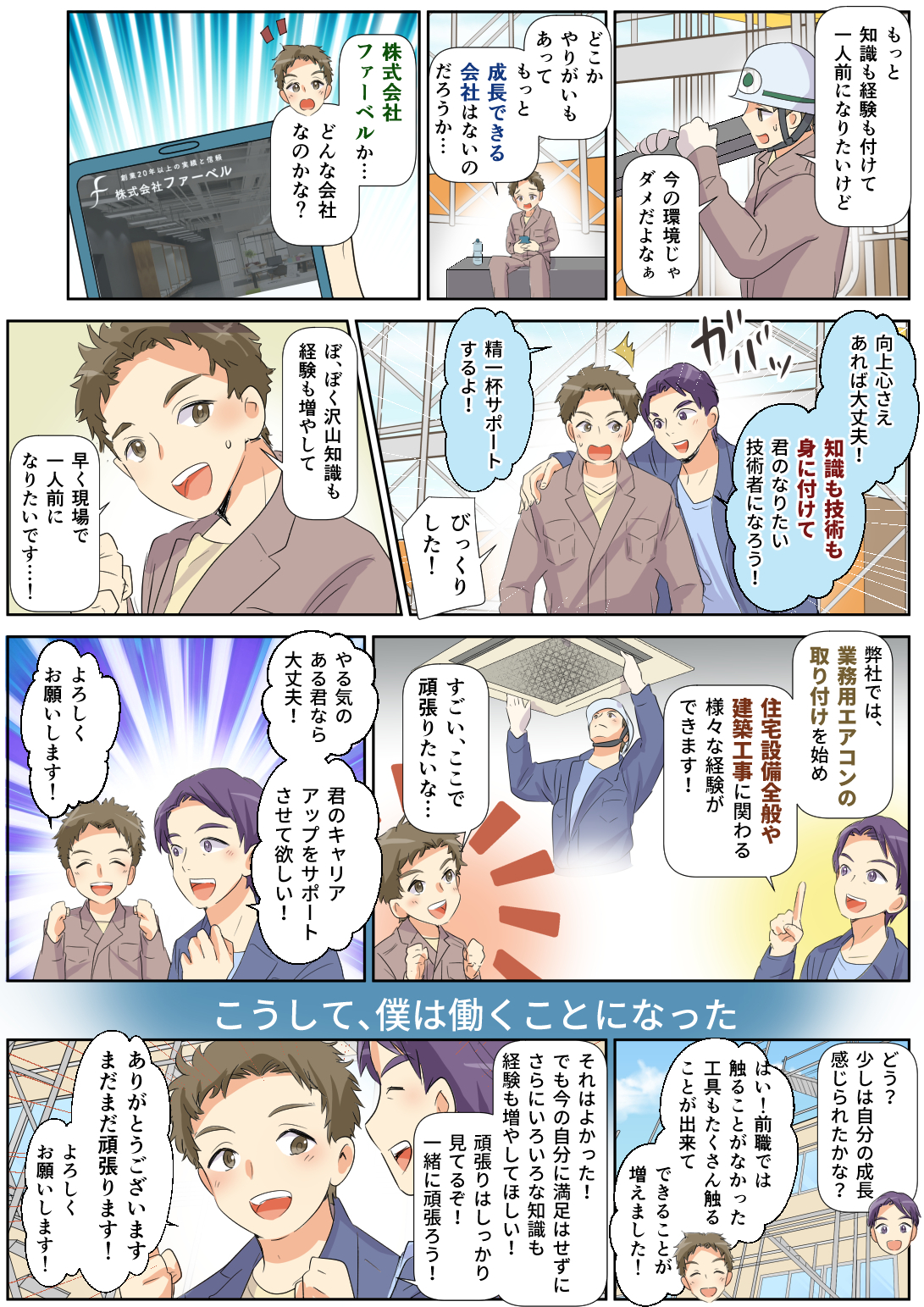 実業務用エアコン取り付け・ダクト工事・施工管理・空調工事、水道配管工事が未経験の方でも、先輩従業員が丁寧に指導していきますので安心してください。女性の方も大歓迎です!